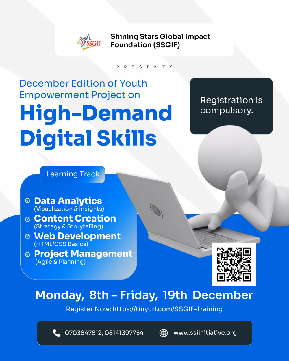 Do you want to enhance your skills and become a trailblazer in the tech industry? This is your moment! Shining Stars Global Impart Foundation invites all to a FREE Training on Tech Skills designed to help you unlock your potential and gain in-demand skills for the future.